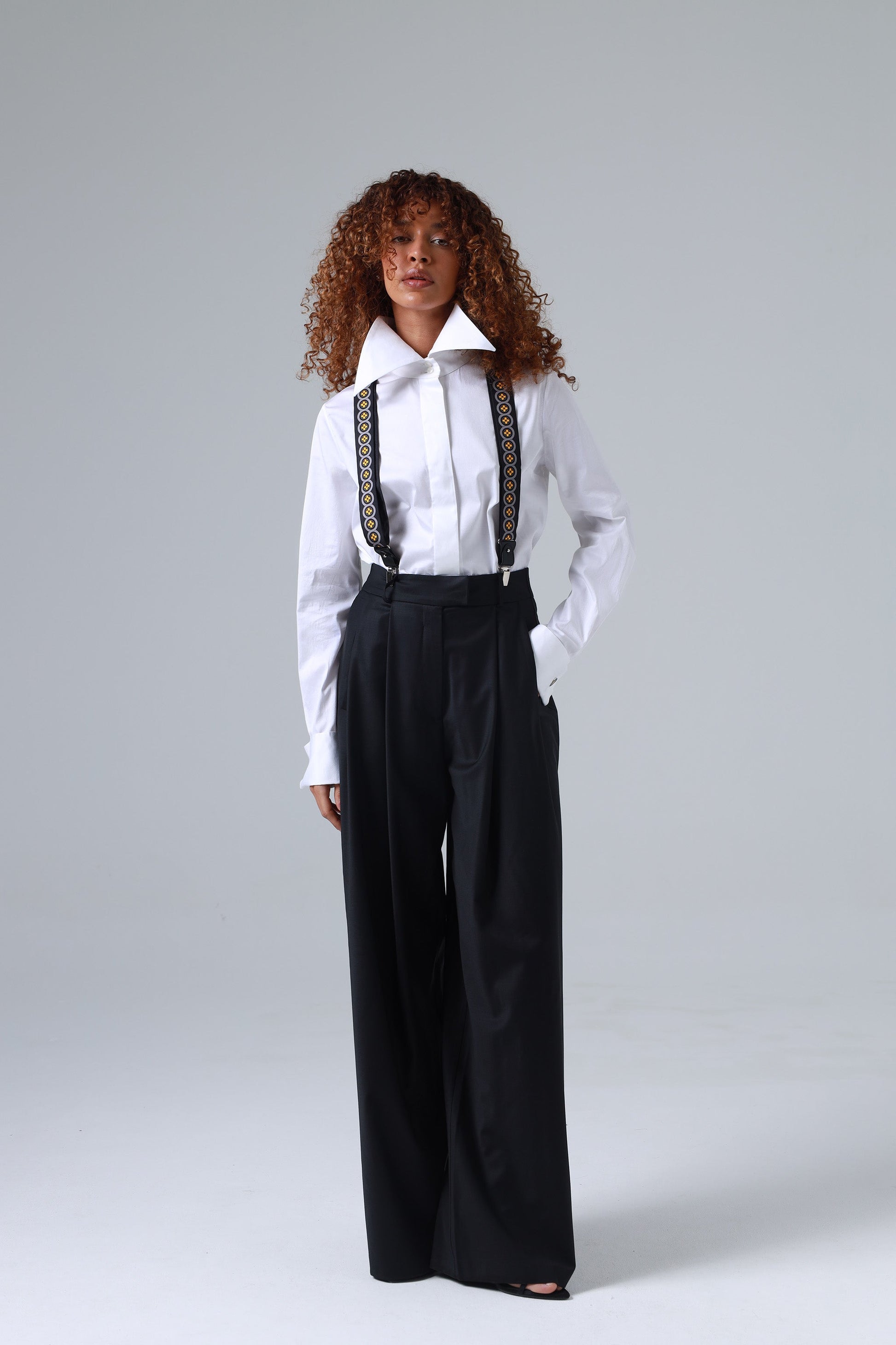 ETNA suspenders have the perfect classic width: 3.5 cm (1 3/8 inches) and minimalist precision-crafted metal adjusters suiting any body type and height flawlessly. Such width will always fit perfectly with any bottom, whether wide or classic pants, as well as with any top, whether slim or oversized shirts. The suspenders contain elements that allow them to be used in two ways: metal clips at the end of the straps attaching the suspenders directly to trousers, or leather loops that fasten the suspenders to special buttons on the pants.